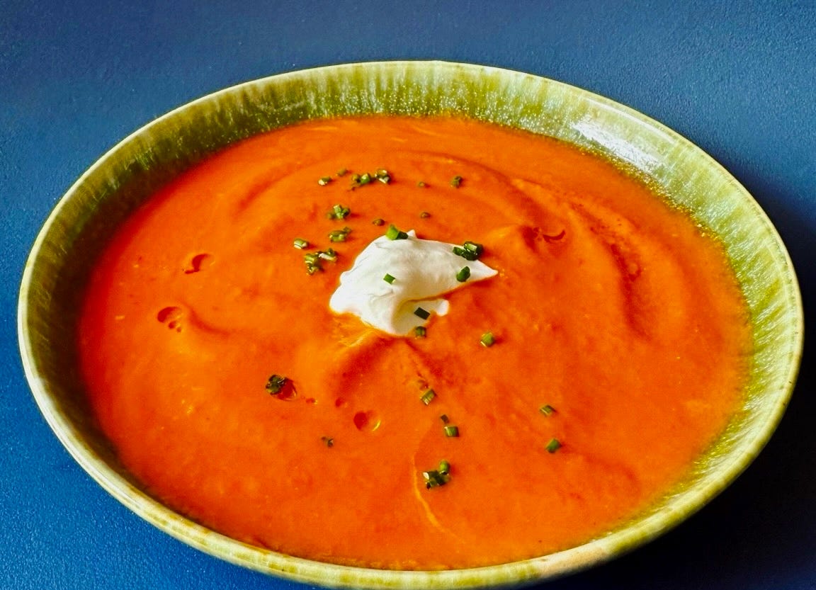 Warmly Spicy Tomato Soup with Harissa. Arugula, Orange, and Onion Salad. Toasted Mozzarella with Olive Spread on Ciabatta.