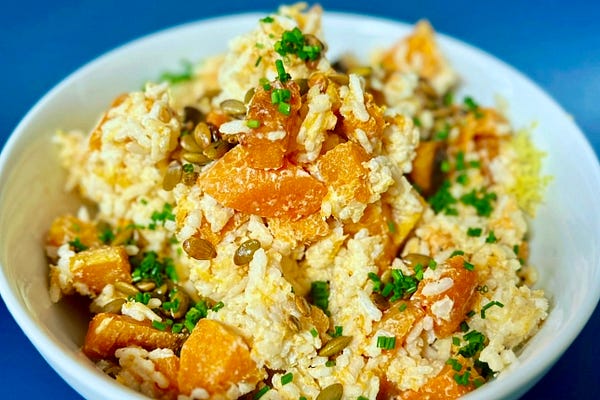 One with caramelized roasted winter squash; the other with pan bagnat flavors folded in. Rice salads, using risotto logic.