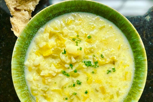 The perfect meal—my chunky potato soup with leeks and onions; a cold, lemony, crunchy baby gem salad; cheddar and blue cheese toasts. Don’t go out. Stay…