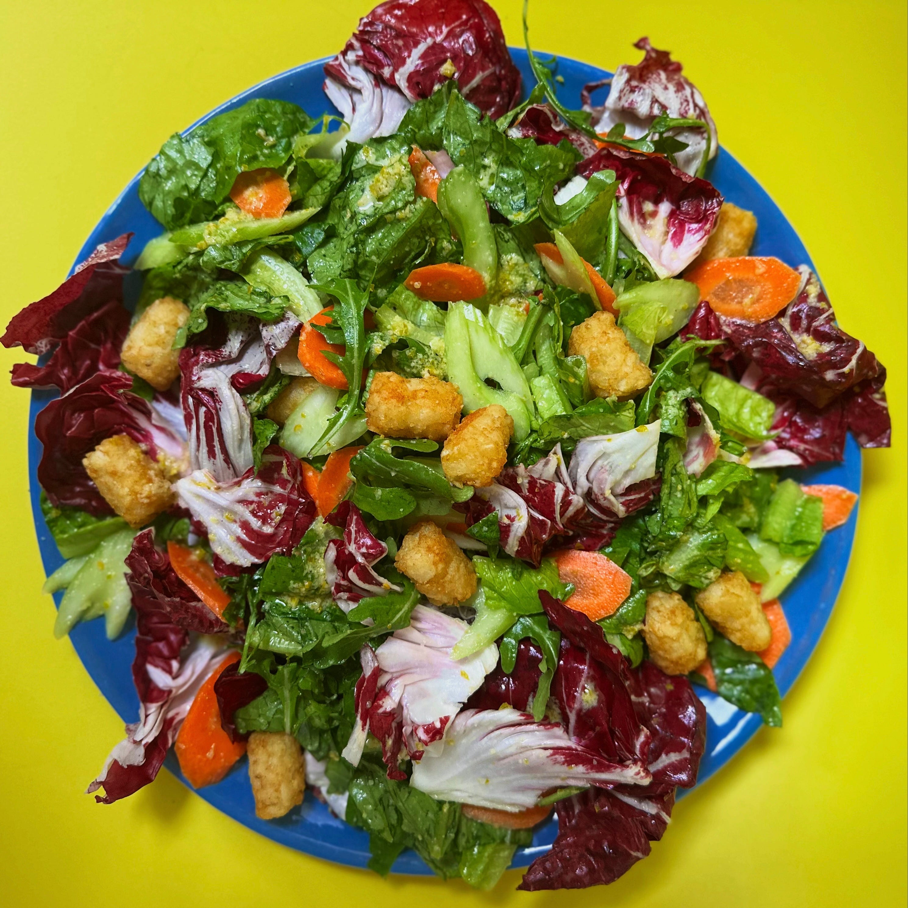 Disorganization Salads: Farro in Green Olive Dressing; A Cold Garden Salad with Crispy Hot Tater Tots and Pepperoncini Dressing.