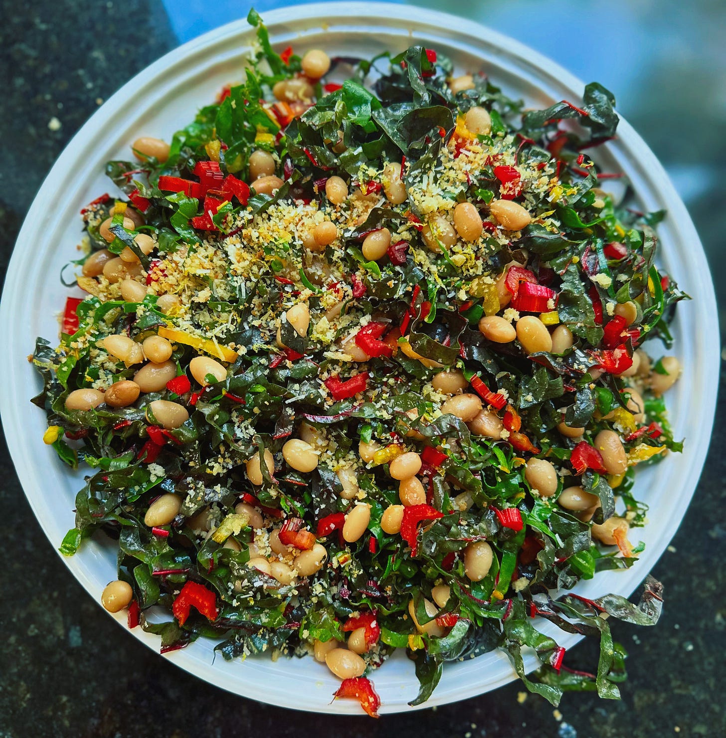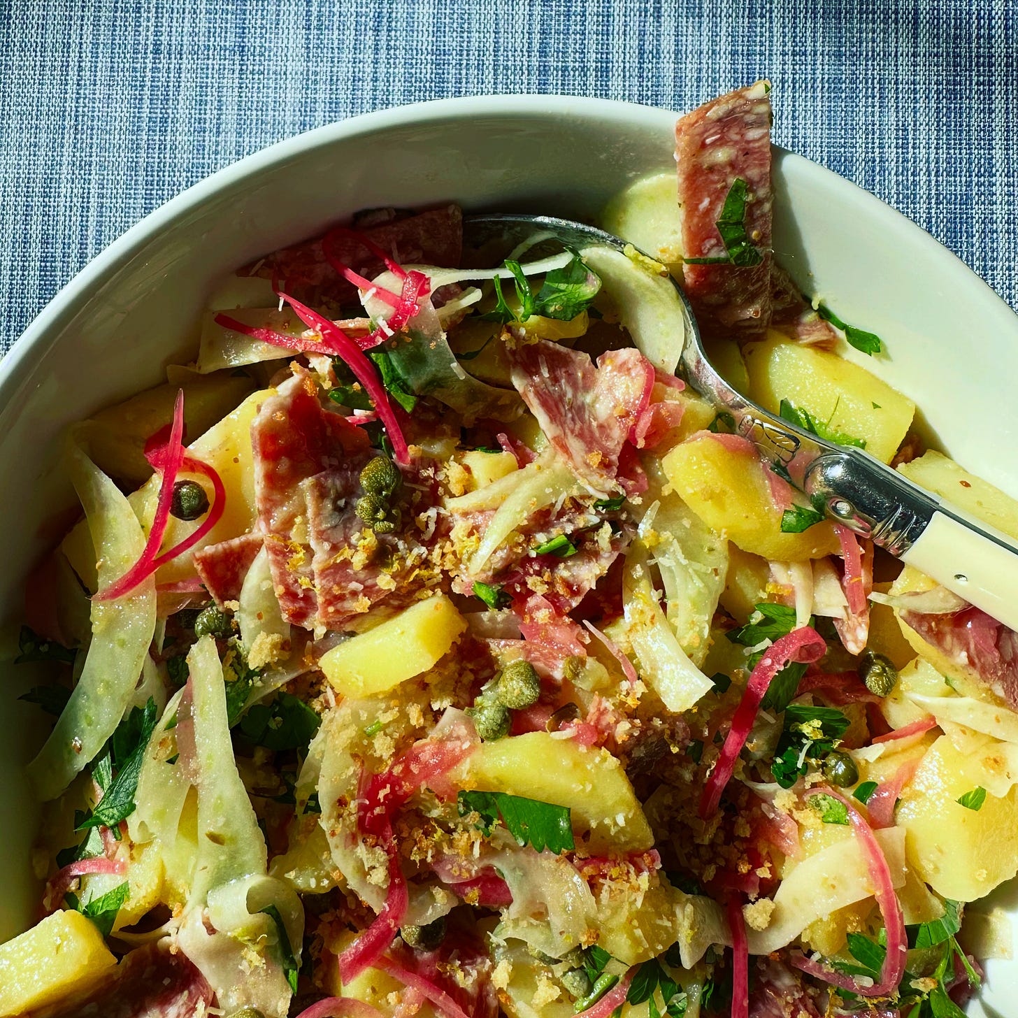 Perfect salads for eating in your dark winter man cave—or woman cave. White beans and chard. Potato and salami. Plus: Let's put crunchy lemon Parmesan bread crumbs on everything.