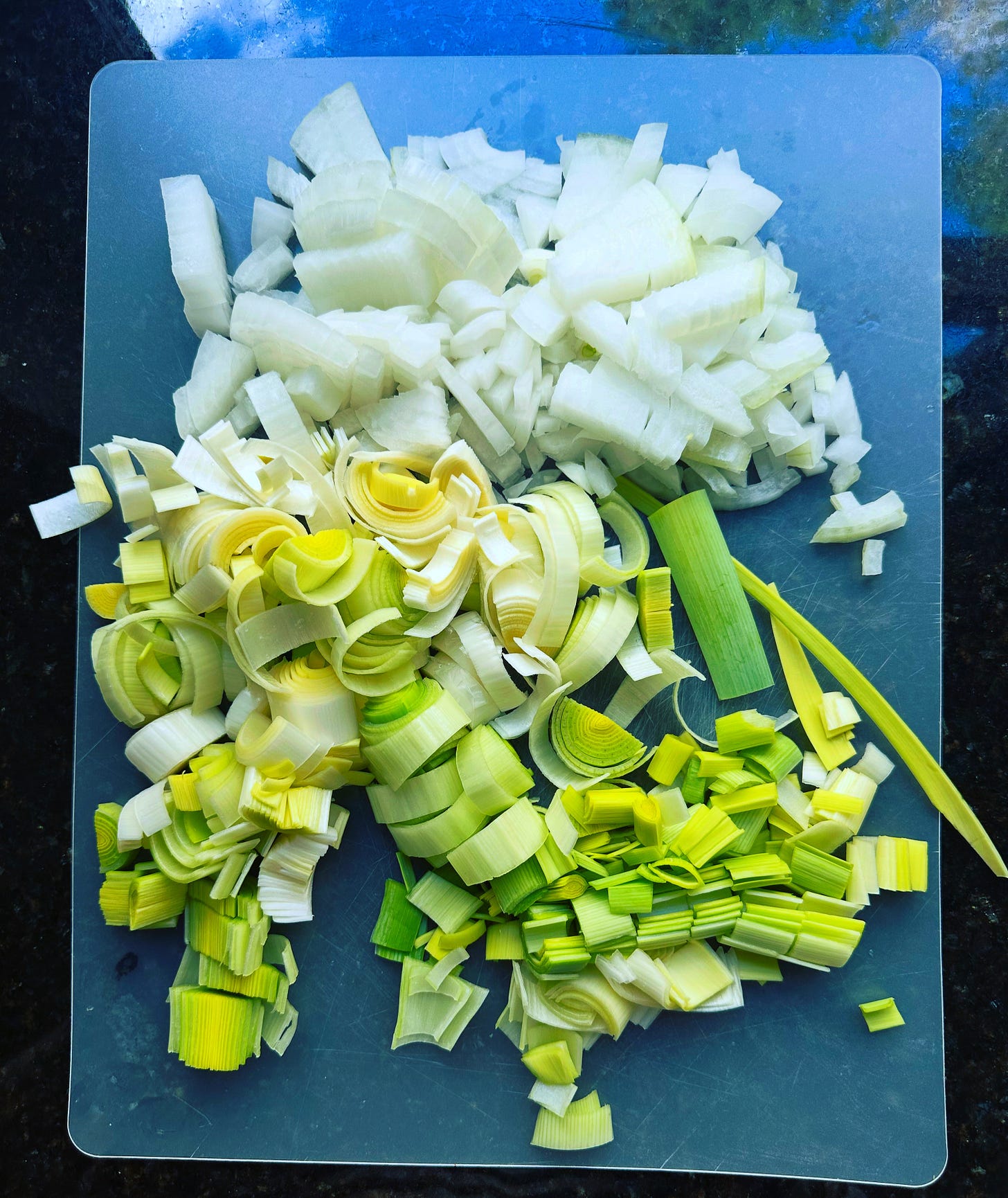 When I finally got out of college and started cooking all the time, because I really enjoyed it, I became what I believed to be a fancy person. And a fancy person was someone who used buttery Yukon Gold potatoes and leeks instead of onions and Idahos. I added stock to replace the plebeian water, grated in some nutmeg, played around with a ratio of milk and cream, and sometimes pureed it, like a rustic vichyssoise.