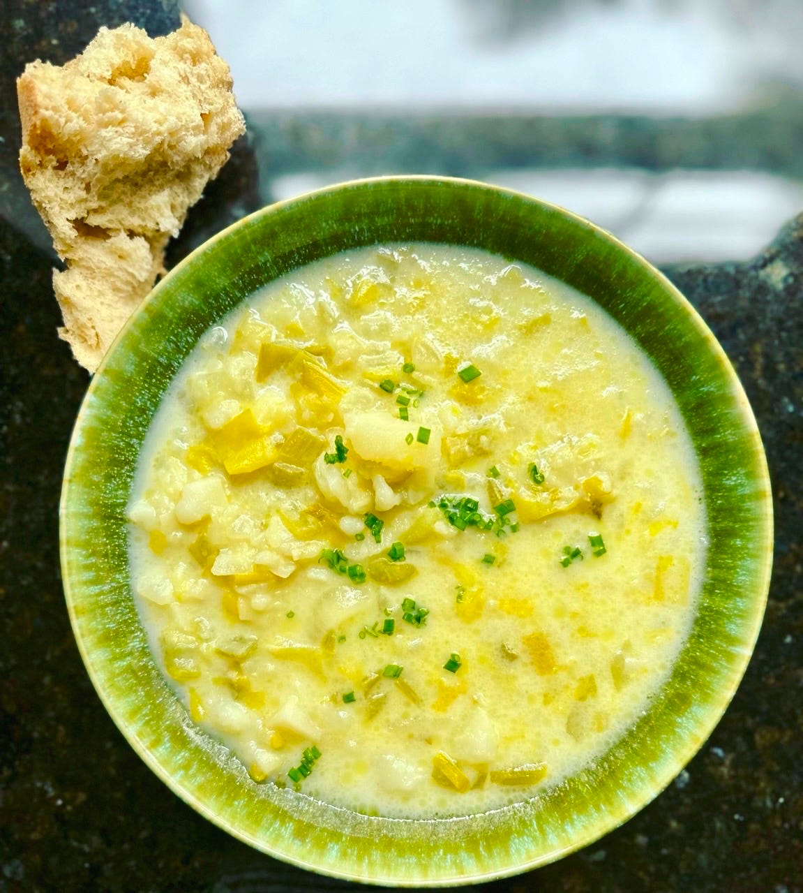 Now, I’m just me—a person who wears athletic socks and clogs with pants that should probably be in the Early American History Museum— but I still love leeks. So now my potato soup mixes one or two leeks with whatever onions I have in my onion bin. This started out of necessity—I had one leek leftover from a different dish—but it turned out so nicely I kept doing it. You get a deep allium backbone from the onion; sweetness and ethereal allium perfume from the leeks. And I decided that the dusty brown russets my mom used create the most desirable, chowdery-brothy texture. After you cook the soup, you mash it a few times with a potato masher so some of the potatoes dissolve into the broth while others stay chunky.